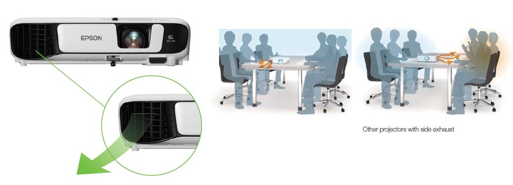 Ống xả phía trước được bố trí thông minh để tránh bất kỳ ai tiếp xúc với ống xả nóng, đặc biệt là khi trên bàn hẹp. Điều này cho phép khán giả của bạn tập trung hoàn toàn vào bài thuyết trình, ngay cả khi họ ngồi bên cạnh hoặc phía sau máy chiếu.
