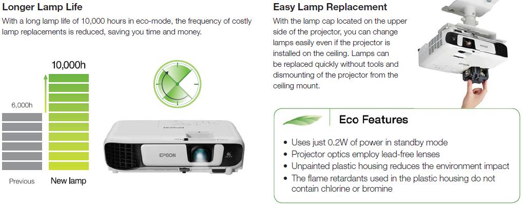 Với tuổi thọ bóng đèn dài 10.000 giờ ở chế độ sinh thái, tần suất thay thế đèn tốn kém sẽ giảm, tiết kiệm thời gian và tiền bạc.