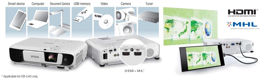 Các tính năng kết nối nâng cao có nghĩa là các phép chiếu thuận tiện và không rắc rối cho bài thuyết trình của bạn. Với giao diện rộng, bạn có thể chọn từ nhiều phương thức kết nối khác nhau bao gồm HDMI, VGA và LAN. Ngoài ra, EB-U42 được trang bị hai cổng HDMI, một trong số đó là hỗ trợ MHL, để tương thích kỹ thuật số tốt hơn.